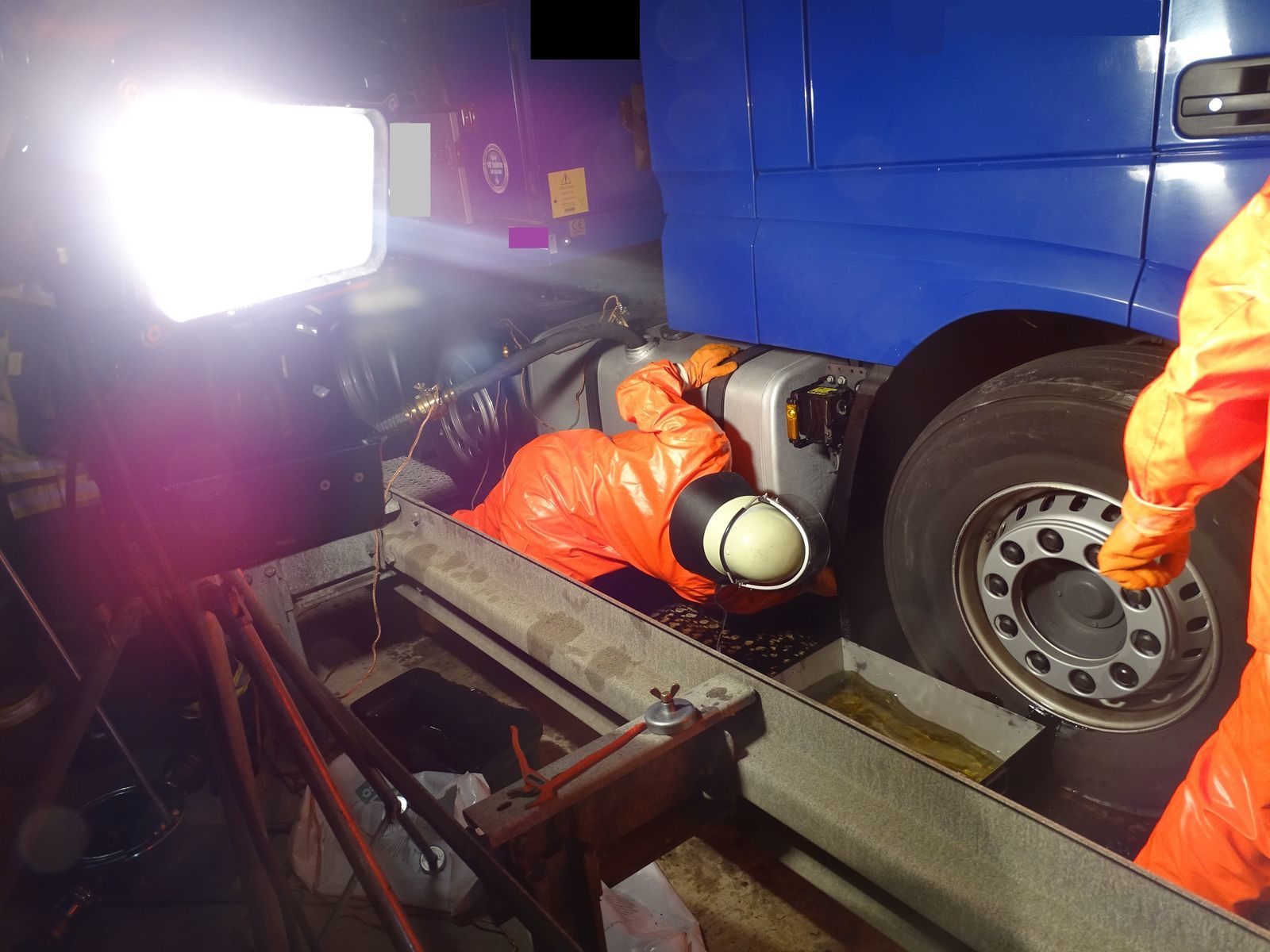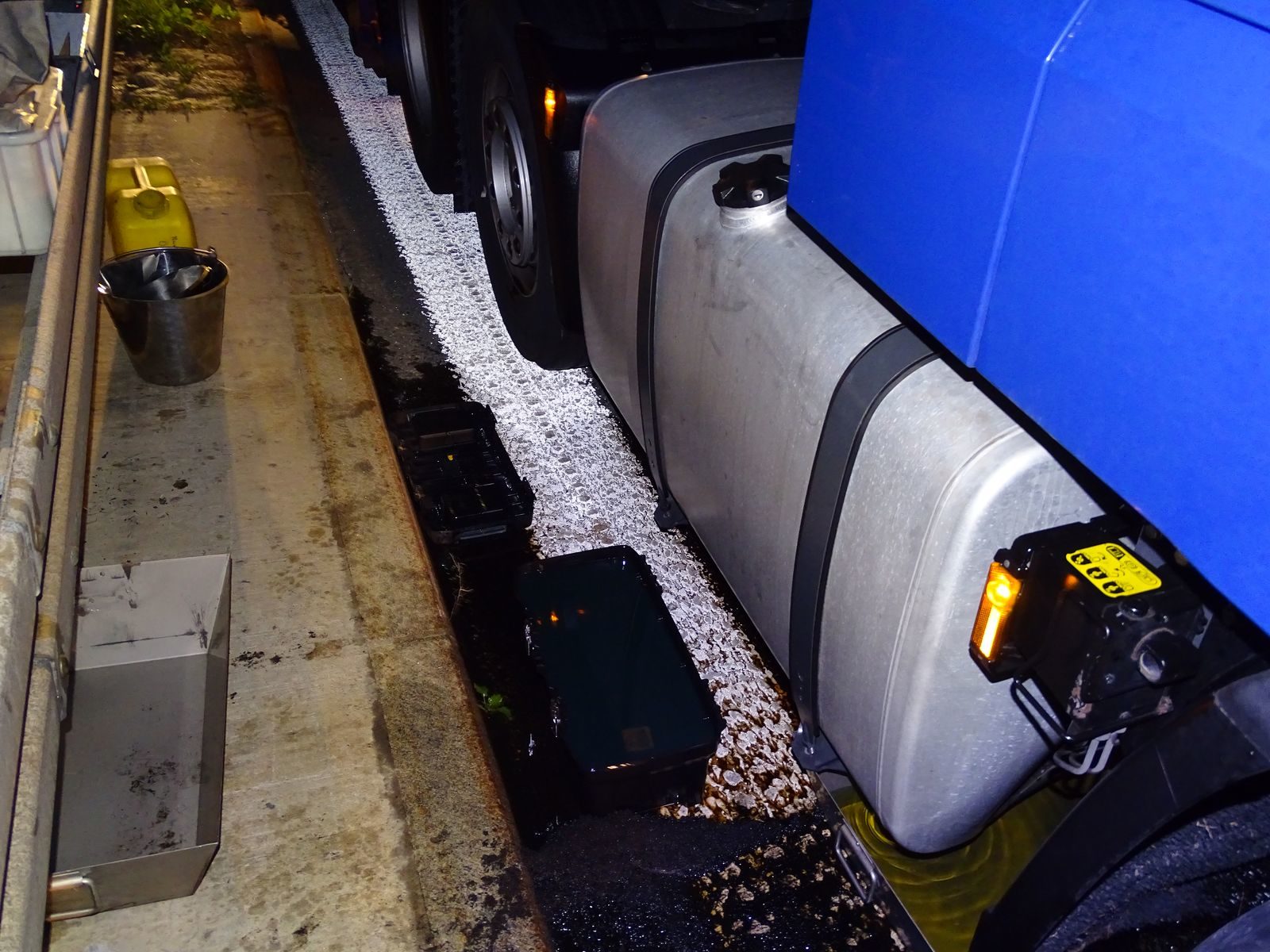 Im Tank verbleibende Menge muss durch Kräfte der Feuerwehr in Fässer umgepumpt werden.