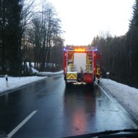 Baum auf Fahrbahn – Die ebenfalls alarmierte Feuerwehr Schönwald beseitigt Baum.