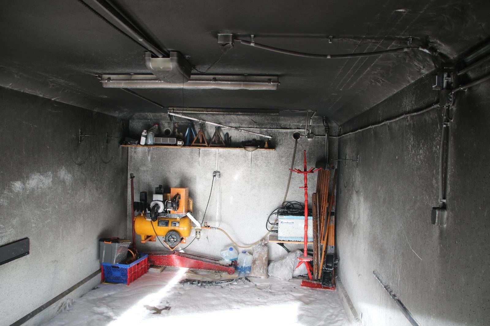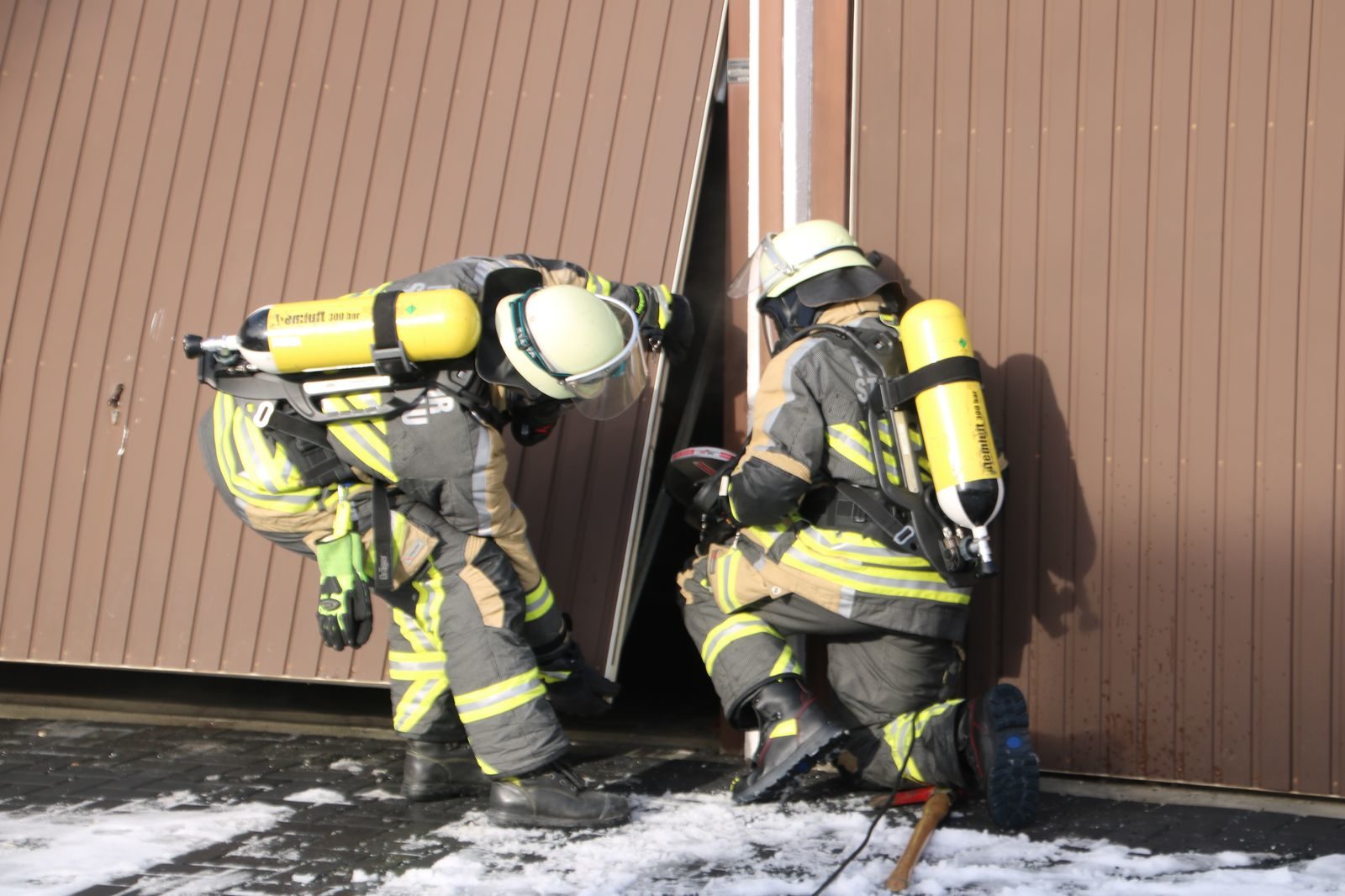 Durch die Besatzung des Löschgruppenfahrzeuges wurde umgehend ein Aufbau vorbereitet und parallel dazu durch den Angriffstrupp, ausgerüstet mit schwerem Atemschutz, das Garagentor gewaltsam geöffnet. Da in der Brandgarage ein automatisches Tor verbaut war, mussten die Öffnungsstreben mittels Elektroflex getrennt werden.