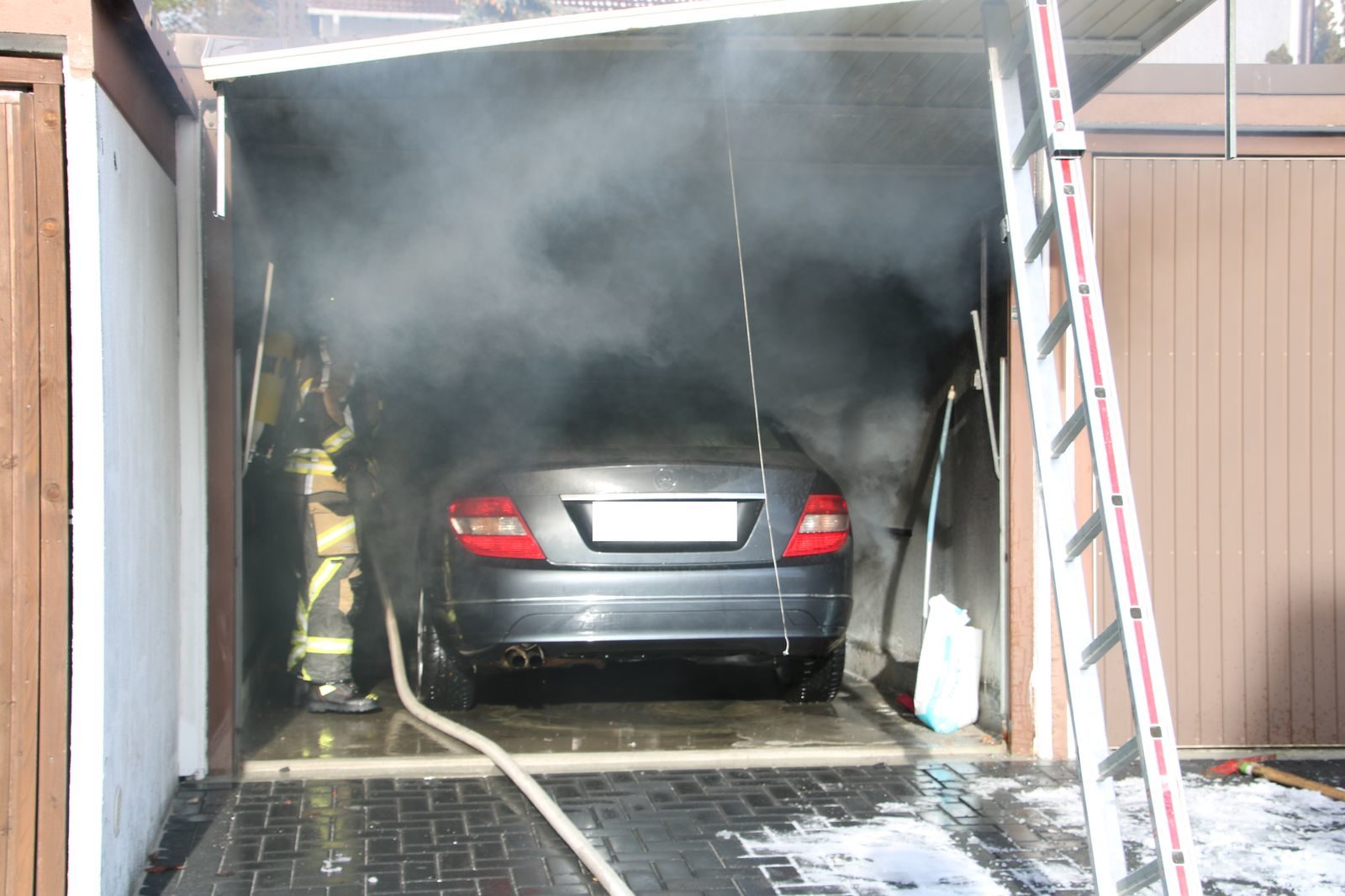 Im Inneren der Garage fand man schließlich einen im Frontbereich brennenden Mercedes vor, welcher durch den Angriffstrupp über ein CAFS-Löschrohr abgelöscht wurde.