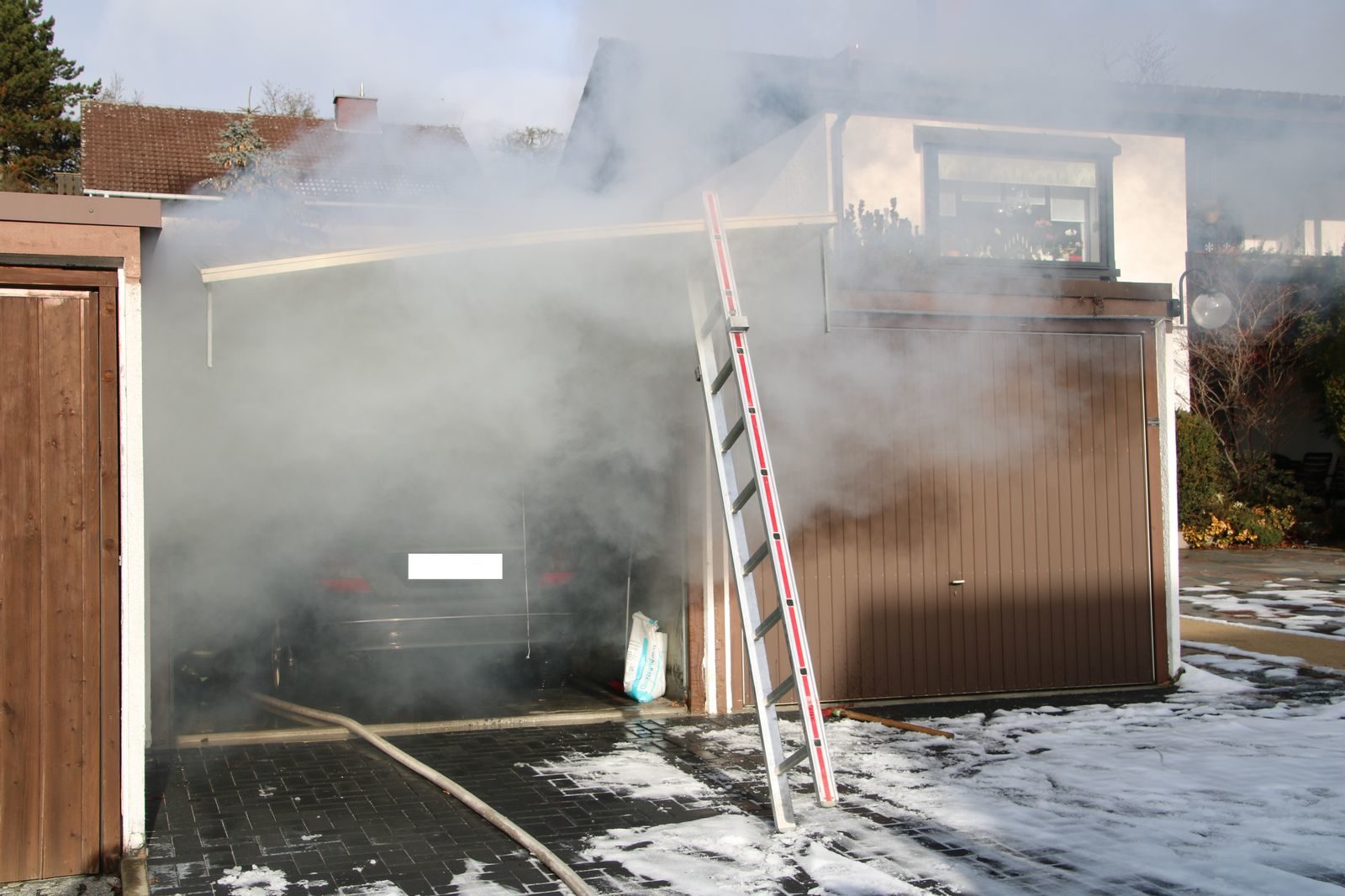 Aufgrund der starken Rauchentwicklung wurde während der Löscharbeiten die Garage belüftet und im Anschluss der PKW ins Freie verbracht.