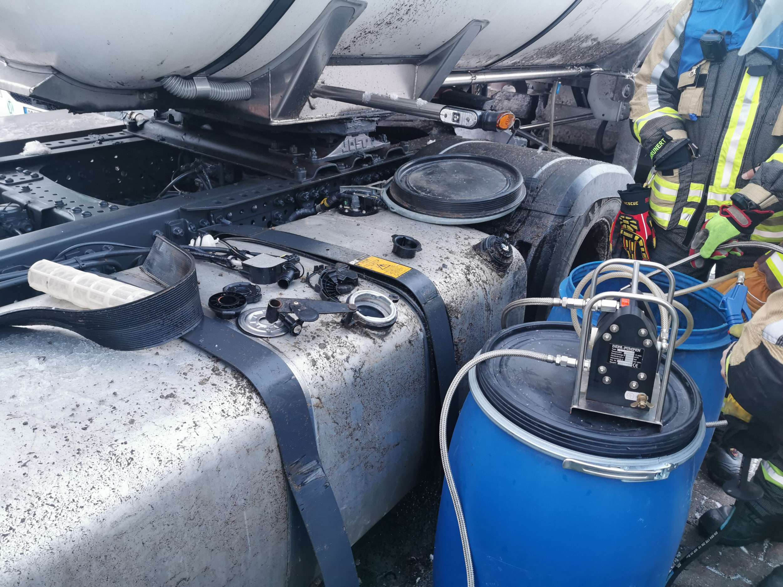Auf dem Parkplatz Bärenholz stand ein LKW mit aufgerissenem Tank. Durch die Feuerwehr Rehau und Regnitzlosau wurde der ausgelaufene Diesel abgestreut und abgebunden. Zusätzlich wurden ca. 120l mittels Druckluft-Membranpumpe aus dem Tank gepumpt.