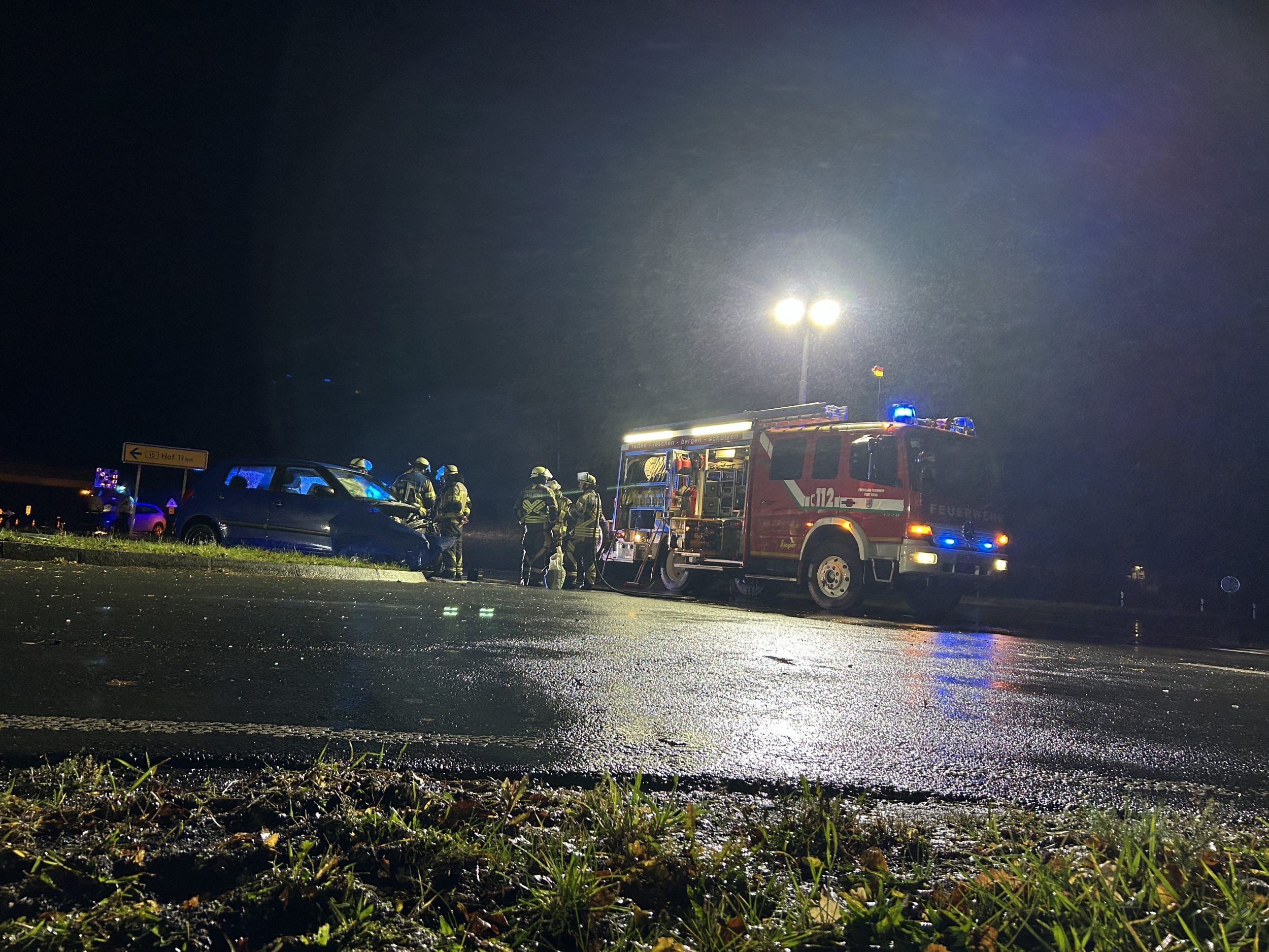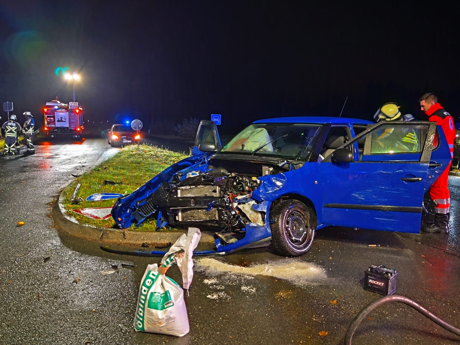 Zwei PKW waren im Kreuzungsbereich zusammengestoßen. Ein schwarzer PKW war nach dem Aufprall von der Fahrbahn abgekommen und kam im angrenzenden Grünstreifen zum Stehen. Der blaue PKW blieb stark beschädigt im Kreuzungsbereich stehen. Insgesamt drei Personen wurden bei dem Unfall verletzt und vom Rettungsdienst versorgt.