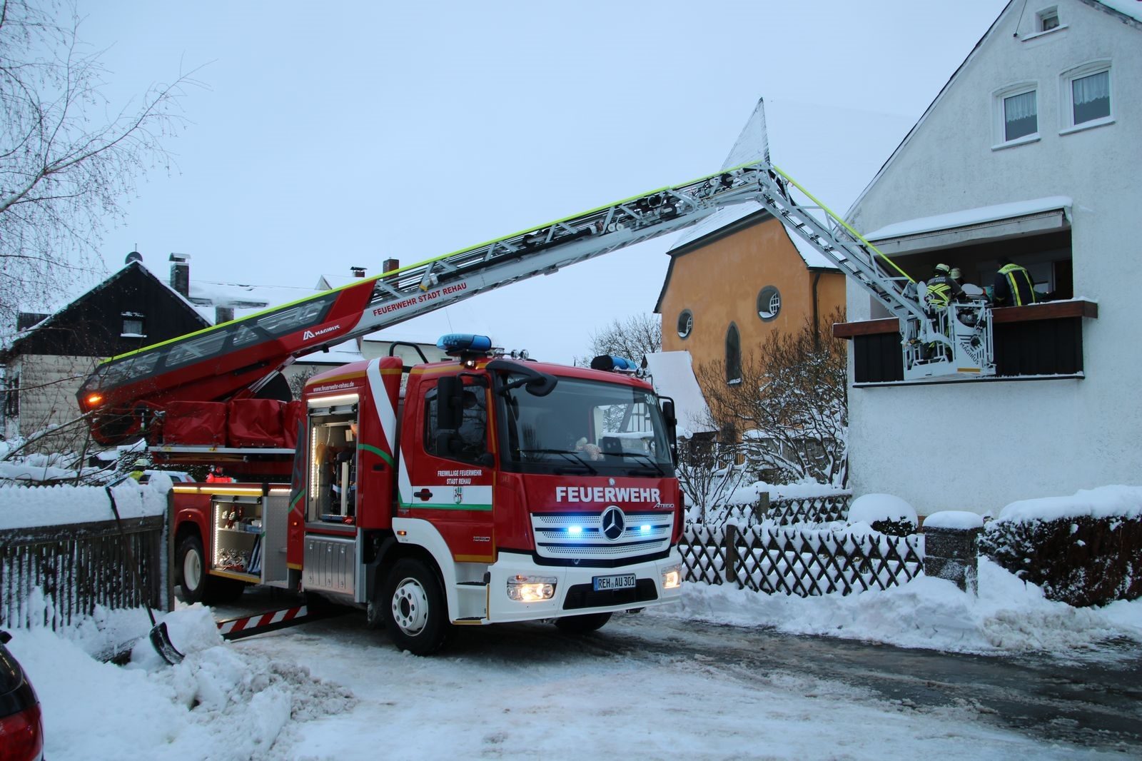 Notfallpatient für Rettungsdienst aus 1. OG über die Drehleiter gerettet.