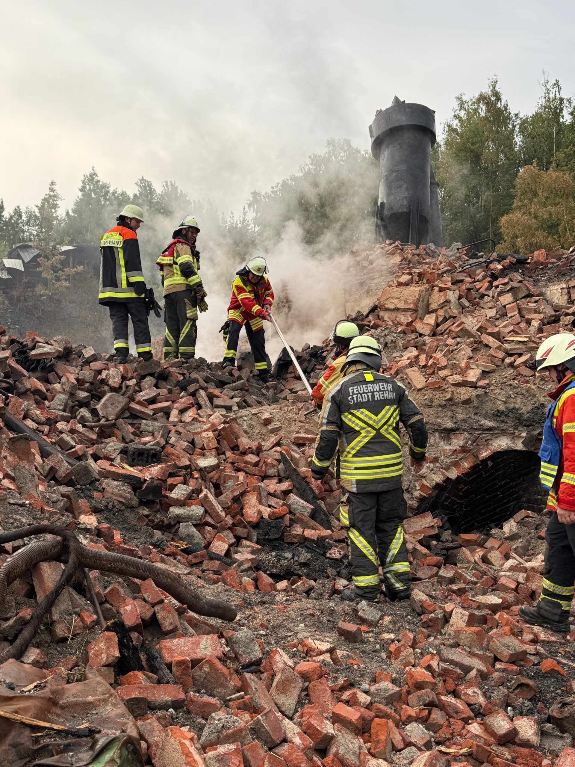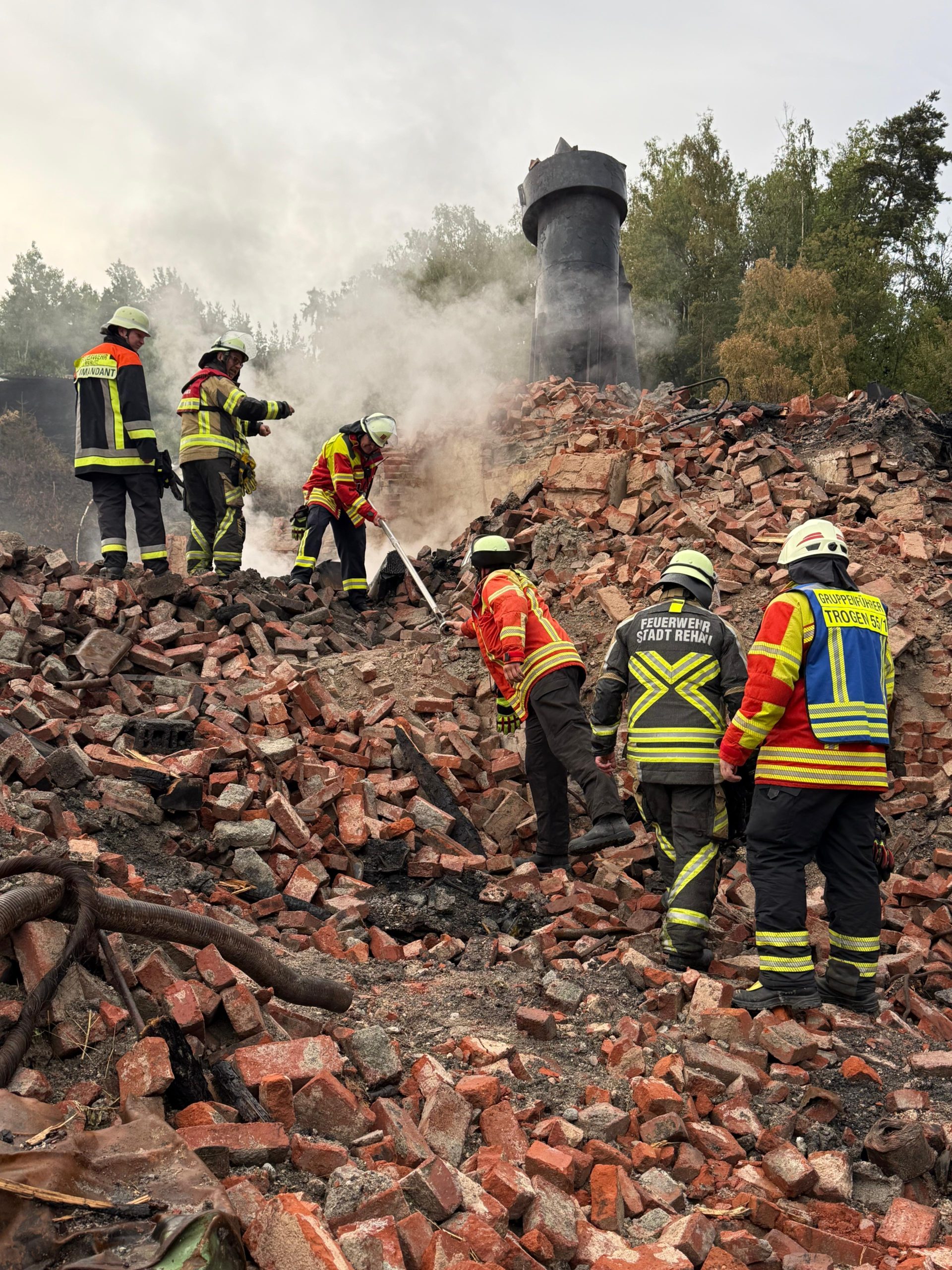 Zudem wurde die Feuerwehr Trogen mit alarmiert, um mit der Waldbrandausrüstung und dem darauf verlastetem Heuwehrgerät gezielt im Schutt löschen zu können.
