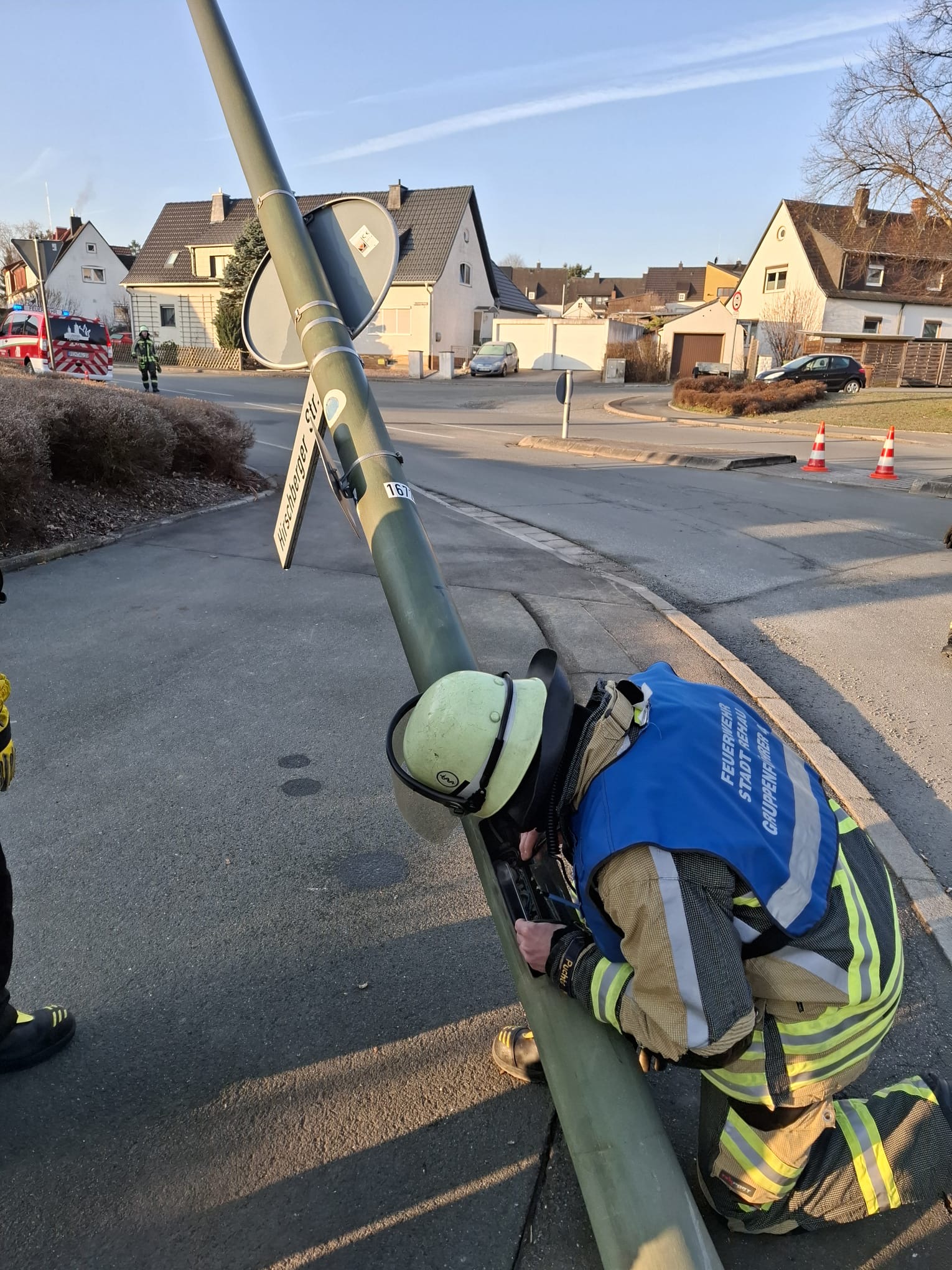 Eine umgeknickte Straßenlaterne musste von der Feuerwehr beseitigt werden, da er drohte Umzufallen.