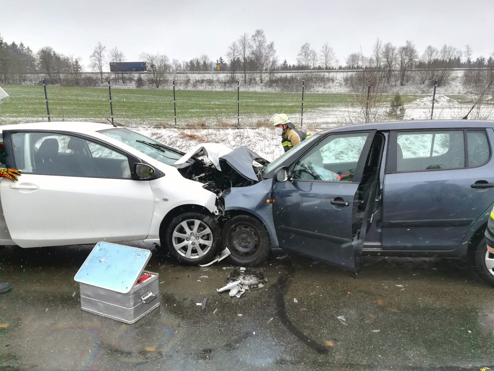 Nach erster Lageerkundung durch den Kreisbrandmeister stellte sich ein Frontalzusammenstoß zweier PKW ohne eingeklemmter Personen dar.
