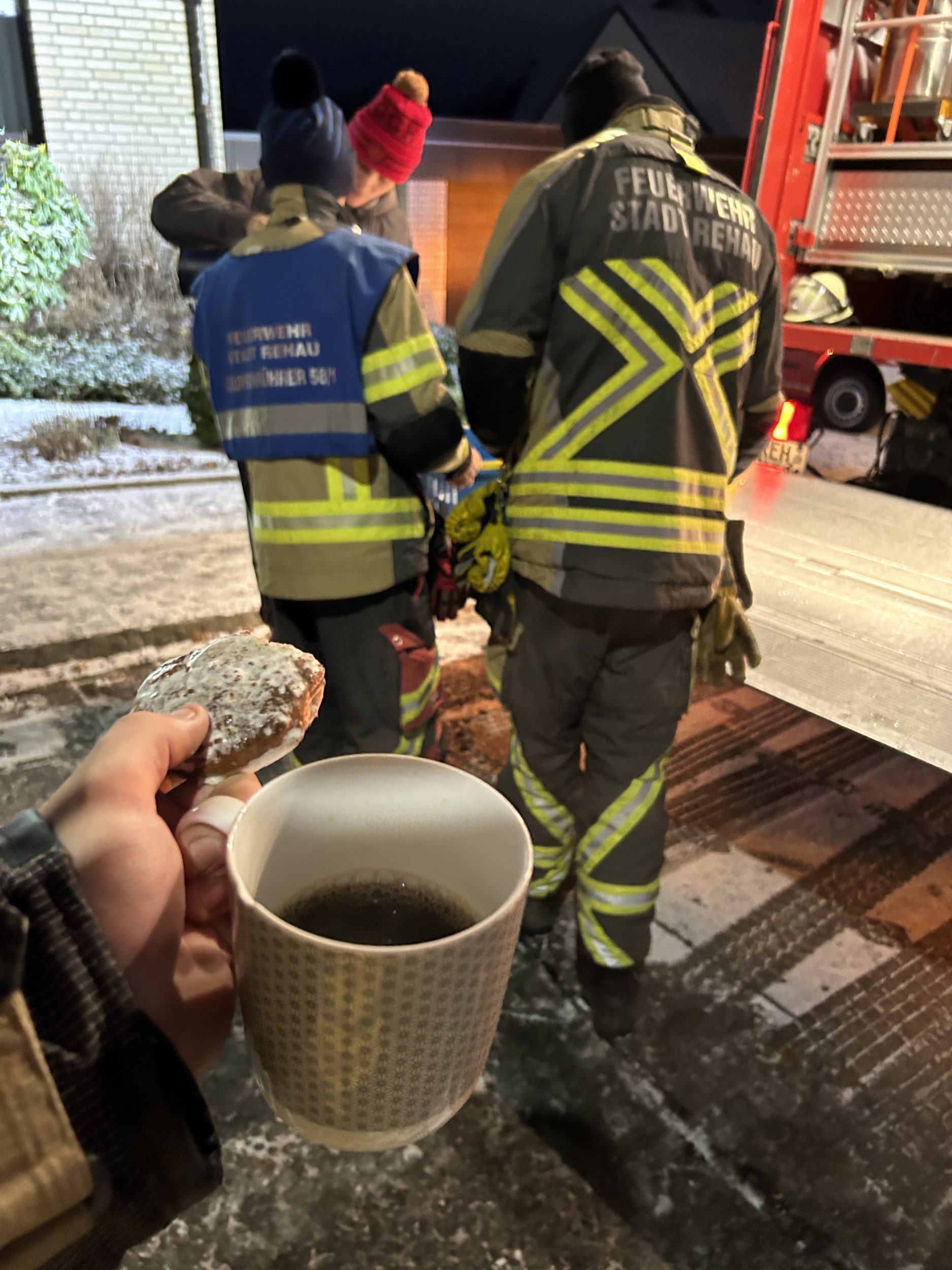 Dankenswerter weise wurden unserer Einsatzkräfte durch einen in der Nachbarschaft wohnenden Kameraden mit Heißem Kaffee und Lebkuchen versorgt.