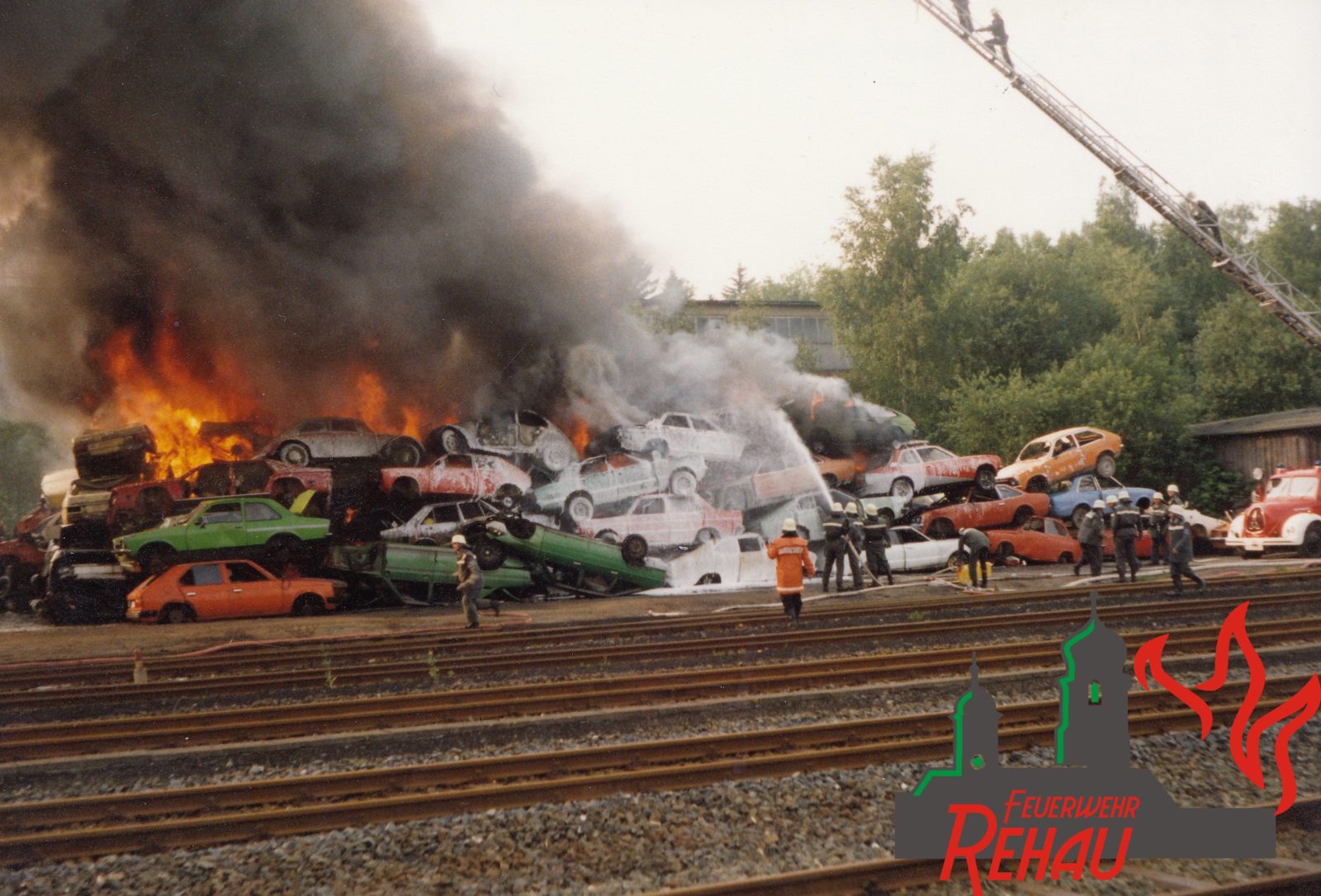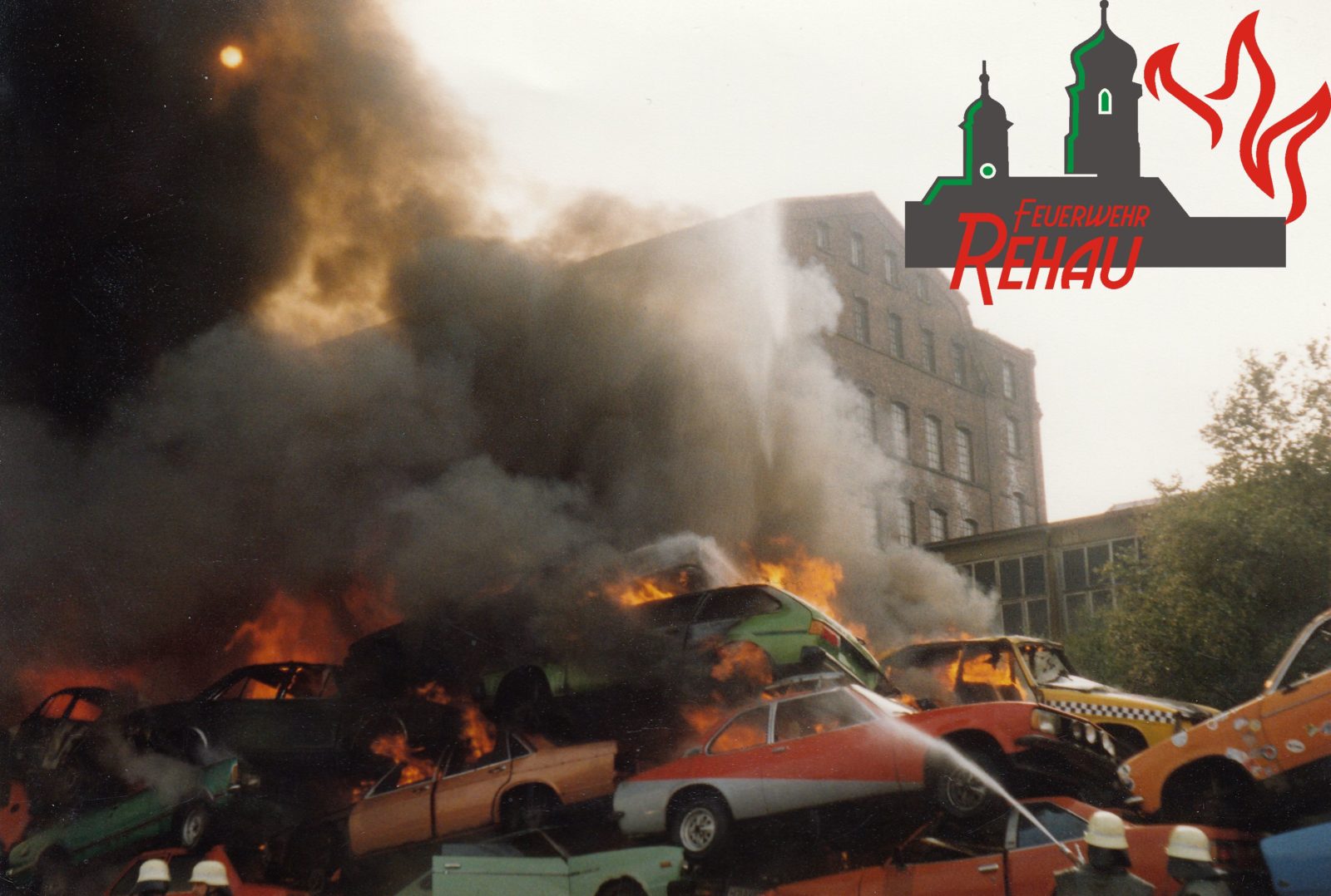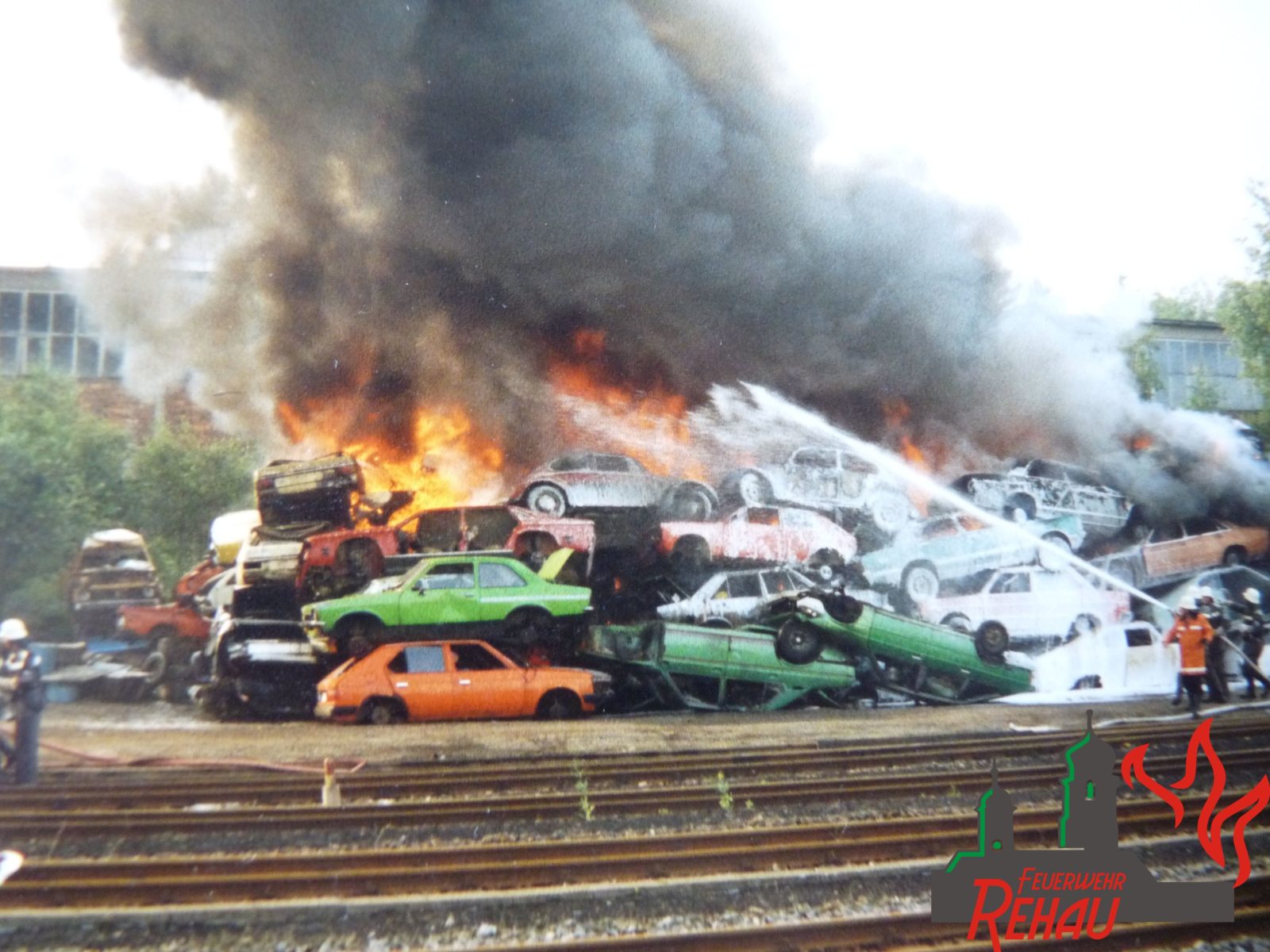 Auf dem Gelände des Schrottplatzes am Bahnhof (heute verläuft hier die Otto-Hahn-Straße) stand ein Berg von Schrottfahrzeugen vollkommen in Brand.